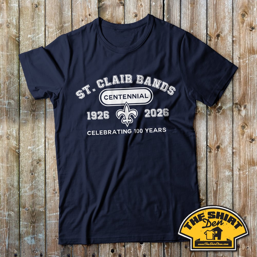 St Clair Bands Centennial T-Shirt celebrating the band's 100 years available on Navy Blue, Red, or Black from Youth sizes S-XL, to Adult sizes S-3XL.